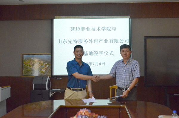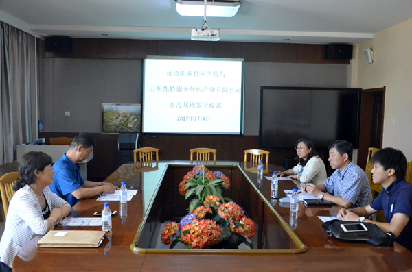 为加强校企合作,促进校企交流,发挥各自优势,实现资源共享,按照平等自愿、互惠双赢、相互促进、共同发展的原则,2017年7月4日下午,延边职业技术学院财经商贸系市场营销与电子商务专业与山东先特服务外包产业有限公司学院综合楼一楼会议室举行延边职业技术学院与山东先特服务外包产业有限公司实习基地签字仪式,参加仪式的有山东先特服务外包产业有限公司的任总和于总,学院教务处处长李京天、财经商贸系系主任金延梅,财经商贸系教研室主任杨镇奉。