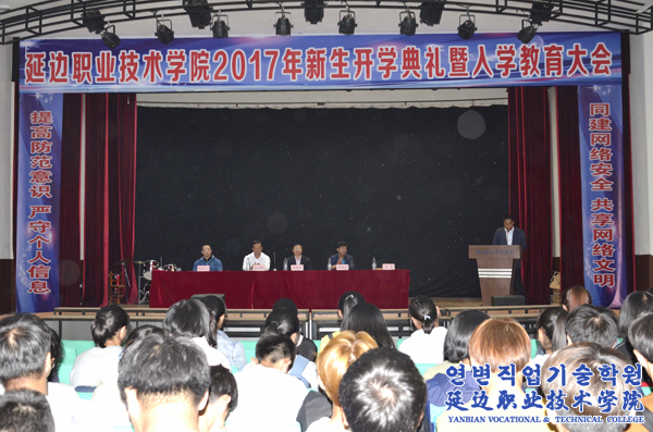 2017年9月19日下午,延边职业技术学院2017级新生开学典礼暨入学教育大会在学院东校区礼堂隆重举行。学院党委书记李树和,院长金永男,副院长李平、石正一、孙海军,各教学系部负责人、相关部门负责人、各班主任以及2017级全体新生参加典礼。典礼由学院副院长李平主持。