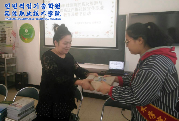 为更好的宣传职业教育,财经商贸系与旅游管理与韩国语系的学生在系部教师的带领下还在学院西校区大门口将各类职业教育书籍赠送给来往的市民和外地游客,使更多的人了解延边职业教育,了解延边风土人情。