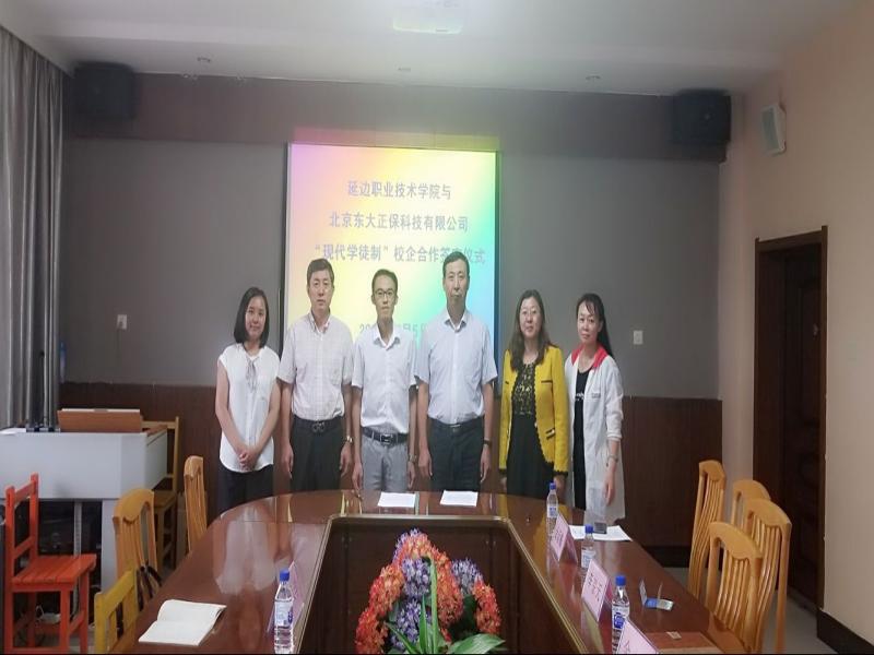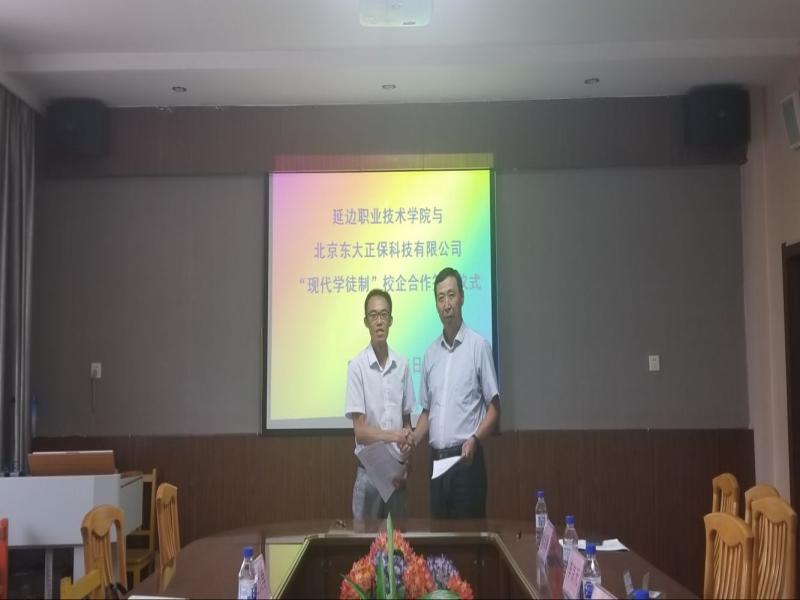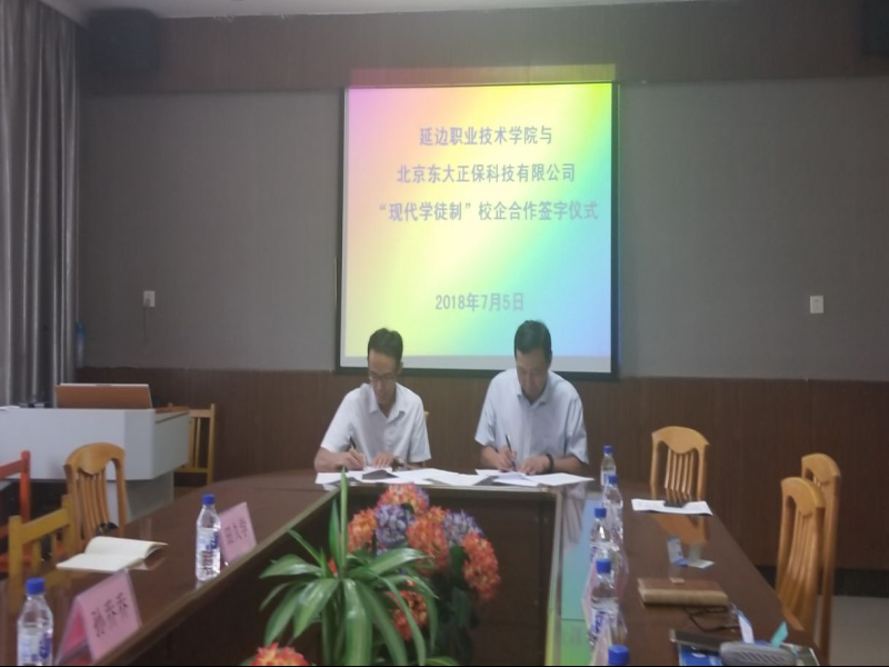 为贯彻落实全国职业教育工作会议精神和《国务院关于加快发展现代职业教育的决定》,切实做好现代学徒制试点工作,根据《教育部关于开展现代学徒制试点工作的意见》(教职成[2014]9号)有关要求,探索建立校企产学研合作、协同育人的长效机制,完善学徒培养的教学文件、管理制度及相关标准推荐专兼结合、校企互聘互用的“双师型”师资队伍建设,建立健全现代学徒制的支持政策,逐步建立起政府引导、行业参与、社会支持,企业和职业院校双主体育人的中国特色现代学徒制。本着优势互补、共同发展的原则,延边职业技术学院和北京东大正保科技有限公司2018年7月5日达成“现代学徒制”校企合作并签订协议。