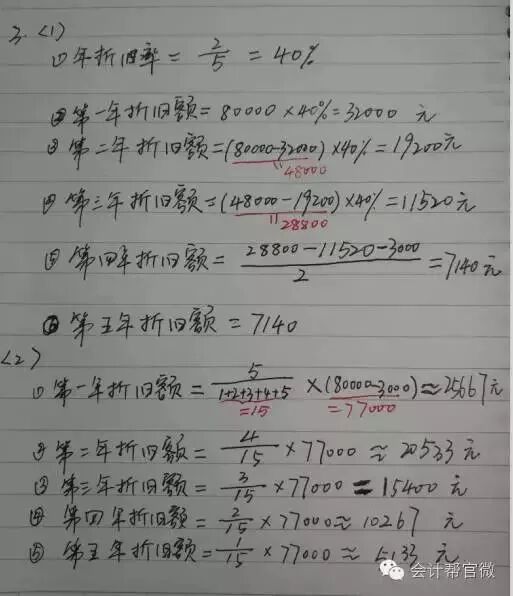 思路导航:注意两点,一个是固定资产账面价值(第一年折旧就是原值,第二年固定资产的账面净值即为原值减去第一年的折旧额);另一个就是最后两年的折旧额的计算方式,要注意!