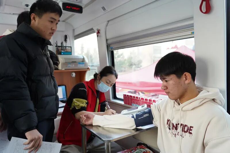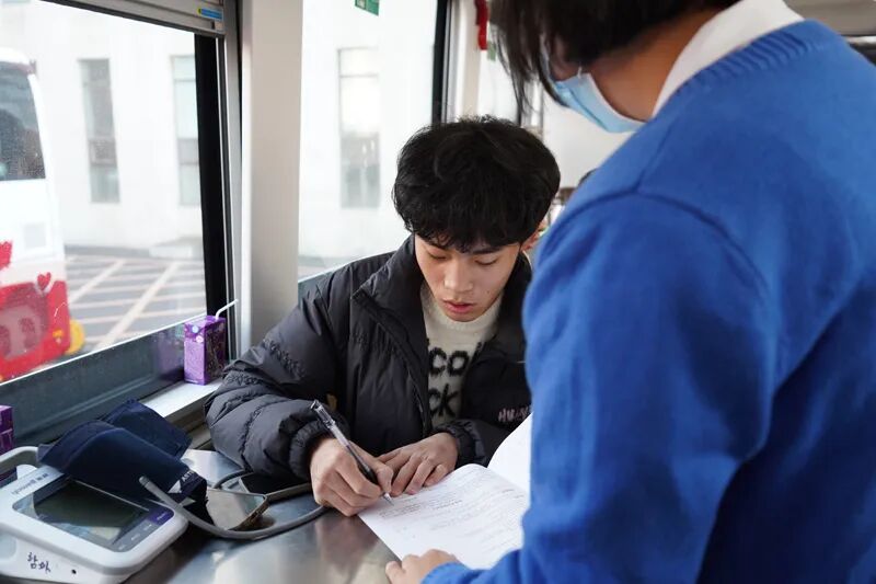 在献血活动现场,延职学子怀着对生命的敬畏与奉献精神,在工作人员的引导下,依次完成信息登记、血压测量、血型检测等前期筛查环节。面对初次献血同学,工作人员主动分享经验,用贴心话语缓解其心理压力;延边州中心血站医护人员则以专业严谨的态度,逐一核对健康信息,耐心解答相关问题。