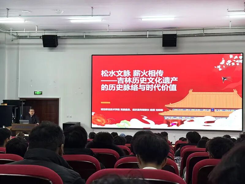 为守护好、传承好、展示好吉林丰富历史文化遗产,增强学院各民族大学生的文化认同感和传承责任感,按照《延边职业技术学院历史文化遗产进校园系列活动实施方案》,2025年11月20日,延边职业技术学院在中和楼同心报告厅成功举办吉林边疆史教育专题讲座,学院2025级学生、青年教师代表共同参与,在图文并茂的讲解与沉浸式互动中,感受吉林边疆文化的深厚底蕴与时代魅力。此次讲座由吉林省高教学会专家,学院党委委员、组织宣传部部长刘晓敏教授以《松水文脉、薪火相传——吉林历史文化遗产的历史脉络与时代价值》为主题,从文明曙光:远古时期的文化根系,交融共生:王朝时期的文化印记,精神铸就:近代以来的红色遗产与工业瑰宝,活态传承:非物质文化遗产的当代活力,守护传承:文化遗产的当代价值与发展路径等五个层面,系统梳理了吉林边疆历史文化的发展脉络,深刻阐释吉林历史文化遗产中蕴含的民族精神和家国情怀。并希望大家课后走进身边的博物馆、文化遗址、红色教育基地,亲身感受各民族交往交流交融的历史印记和中国共产党领导下的团结协作与共同繁荣。通过本次吉林边疆史教育专题讲座,学院师生深入了解吉林历史文化中蕴含的中华民族共同体价值,感受吉林历史文化的独特魅力。大家纷纷表示,将以此次讲座为契机,把文化自信融入学习工作与生活,以实际行动守护文化根脉、担当时代责任,自觉成为铸牢中华民族共同体意识的坚定信仰者、积极传播者、模范践行者,为中华文化传承发展注入青春力量。