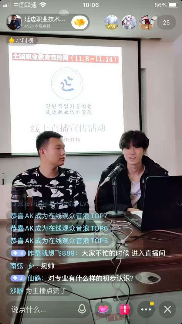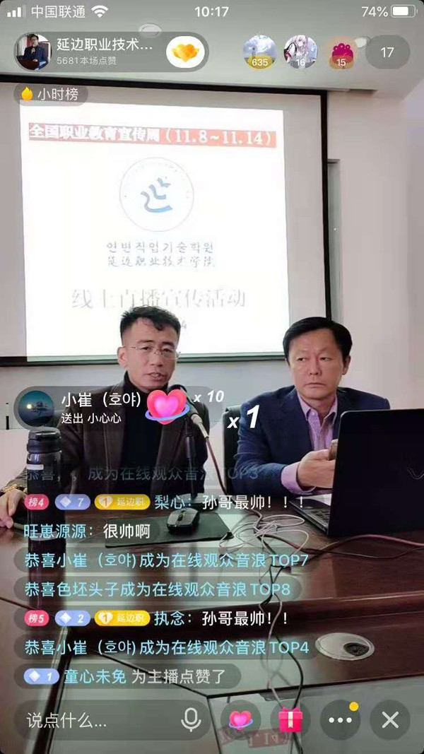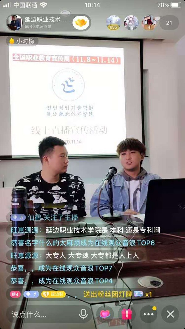 按照省教育厅《关于深入开展2020年吉林省职业教育宣传月活动的通知》要求和学院2020年职业教育宣传月、活动周部署,为深入开展职教宣传月、活动周工作,延边职业技术学院招生处于2020年 11月14日上午,通过抖音和快手平台,开展全国职业教育宣传周线上直播宣传活动,活动中,学院招生处蔡鹤权老师解读有关职业教育政策,介绍学院宣传周活动和学院概况,展现学院办学特色。同时,学院新生、老生和辅导员代表和部分学院“自媒体社团”成员们到演播现场进行交流和互动,取得了良好的宣传效果。