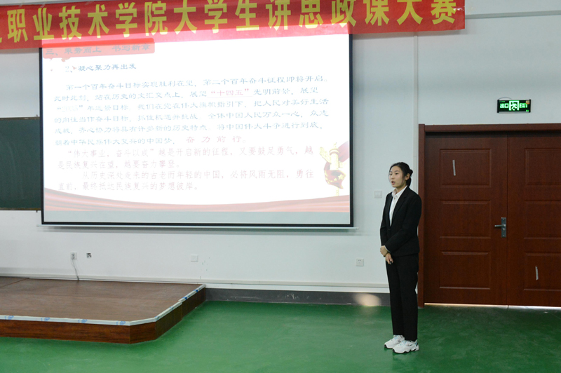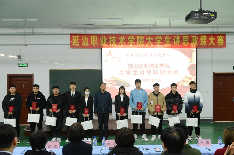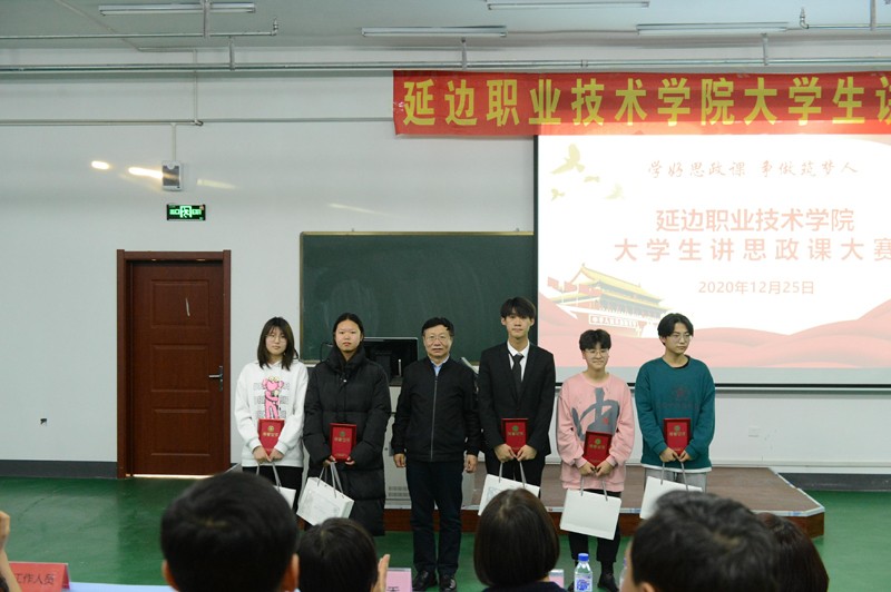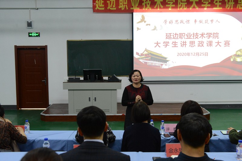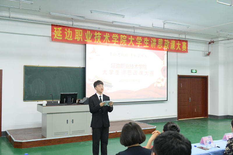 为深入贯彻落实习近平总书记关于教育的重要论述,特别是学深悟透习近平总书记在学校思想政治理论课教师座谈会上的重要讲话精神。由学院党委指导,思想政治理论部承办的“绽放抗疫青春,决胜全面小康”延边职业技术学院第二届大学生讲思政课大赛于2020年12月25日在学院中和楼312进行决赛活动。经过初赛,最终八支参赛团队进入决赛。学院党委书记李树和、院长金永男、党委副书记姜英玉、副院长崔光勋、副院长史春旺参加活动。学院教务处处长李今花、学生工作处处长白刚、第一届思政课比赛获奖学生代表邱建军和杨曦瑶担任本次比赛评委。