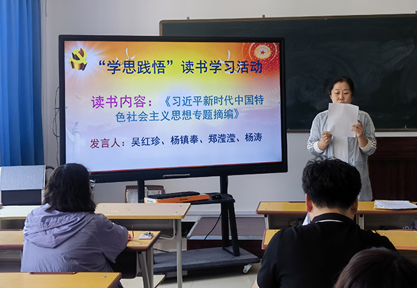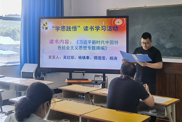 吴红珍同志分享学习习近平新时代中国特色社会主义思想的心得,增强使命感和责任感,为建设社会主义现代化强国做出更大贡献。杨镇奉同志分享学习《习近平新时代中国特色社会主义思想专题摘编》心得,从党的百年奋斗历程中汲取智慧力量,做到勤学善思,坚持人民至上,敢于善于斗争,严守纪律规矩,起而行之、勇挑重担。郑滢滢同志表示,今后不断提高自身综合素质,发扬“德才兼备,以德为本”的教育理念,让学生在教师们的言传身教中汲取正能量、实现成长。杨涛同志表示,习近平新时代中国特色社会主义思想为推动人类文明发展进步贡献中国智慧和中国方案,对推动人类文明进步作出世界性贡献。