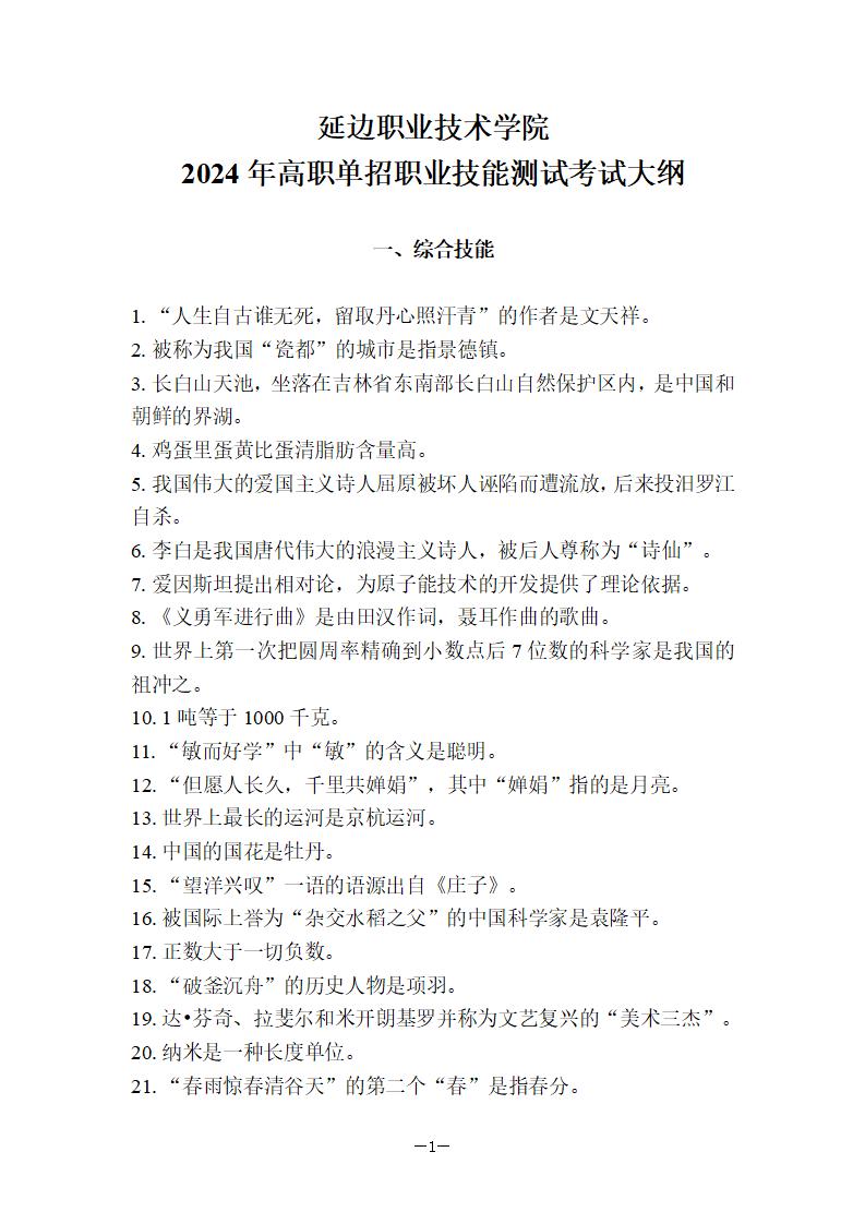 延边职院2024年单招职业技能测试考试大纲