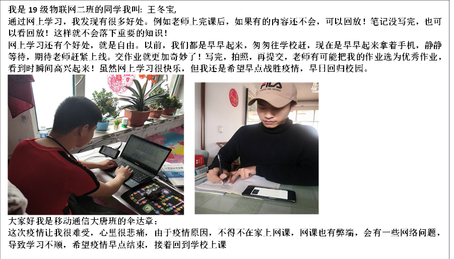 课前,老师们认真准备,通过努力,学会运用智慧树、钉钉、超星、瞩目、腾讯会议等直播平台进行网络授课。同时,老师们通过建立微信群、QQ群等方式,确保与学生进行有效交流,掌握好学生动态以及关心学生。系部全面加强了线上教学工作的组织与管理,建立了授课教师、学生、辅导员、班主任联动机制,确保教学相关信息的准确上报与下达;同时鼓励系部教师深入线上课堂进行听课,确保线上学习与线下课堂教学质量实质等效。