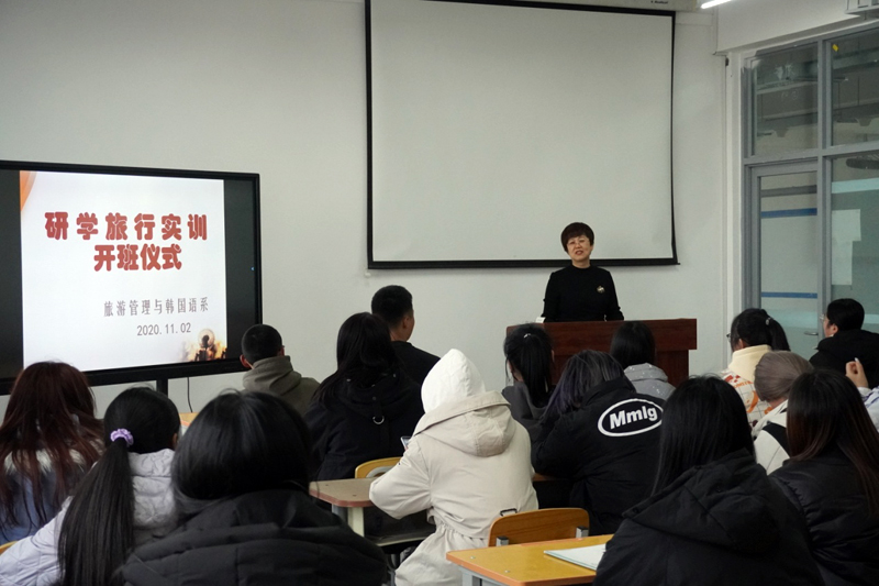 按照省教育厅《关于深入开展2020年吉林省职业教育宣传月活动的通知》要求和学院2020年职业教育宣传月、活动周部署,为深入开展职教宣传月、活动周工作,延边职业技术学院旅游与韩语系旅游管理专业邀请北国少年旅行社有关企业教师于2020年11月起开始对系部学生及旅游专业全体教师进行为期两个月培训。2020年11月2日,学院旅游与韩语系在5号楼308室举行研学旅行实训开班仪式,旅游与韩语系主任张凯娃代表系部教师和学生对有关企业教师进行欢迎与感谢,同时希望学生们能够通过此次培训,提升专业技能,为将来就业打下良好的基础。随后北国少年旅行社旅行社教师赵一梦讲解我国研学旅行的发生与发展及研学旅游的意义、有关政策的解读等相关内容,传授研学实践旅行相关理论知识及带团经验。